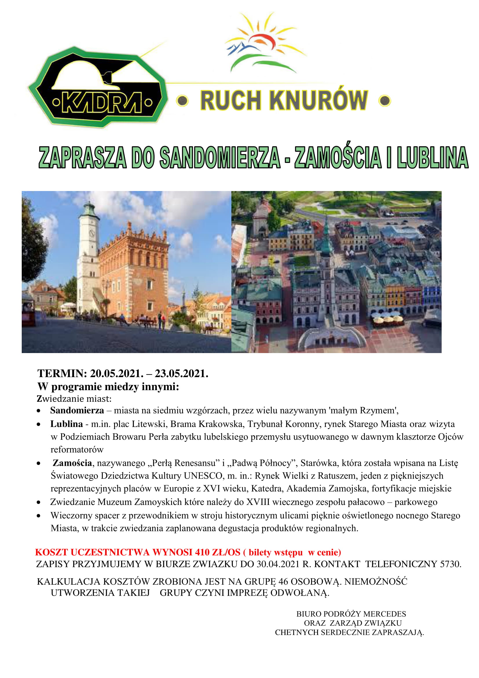 25.05-23.05.2021 Zapraszamy do Sandomierza, Zamościa i Lublina
