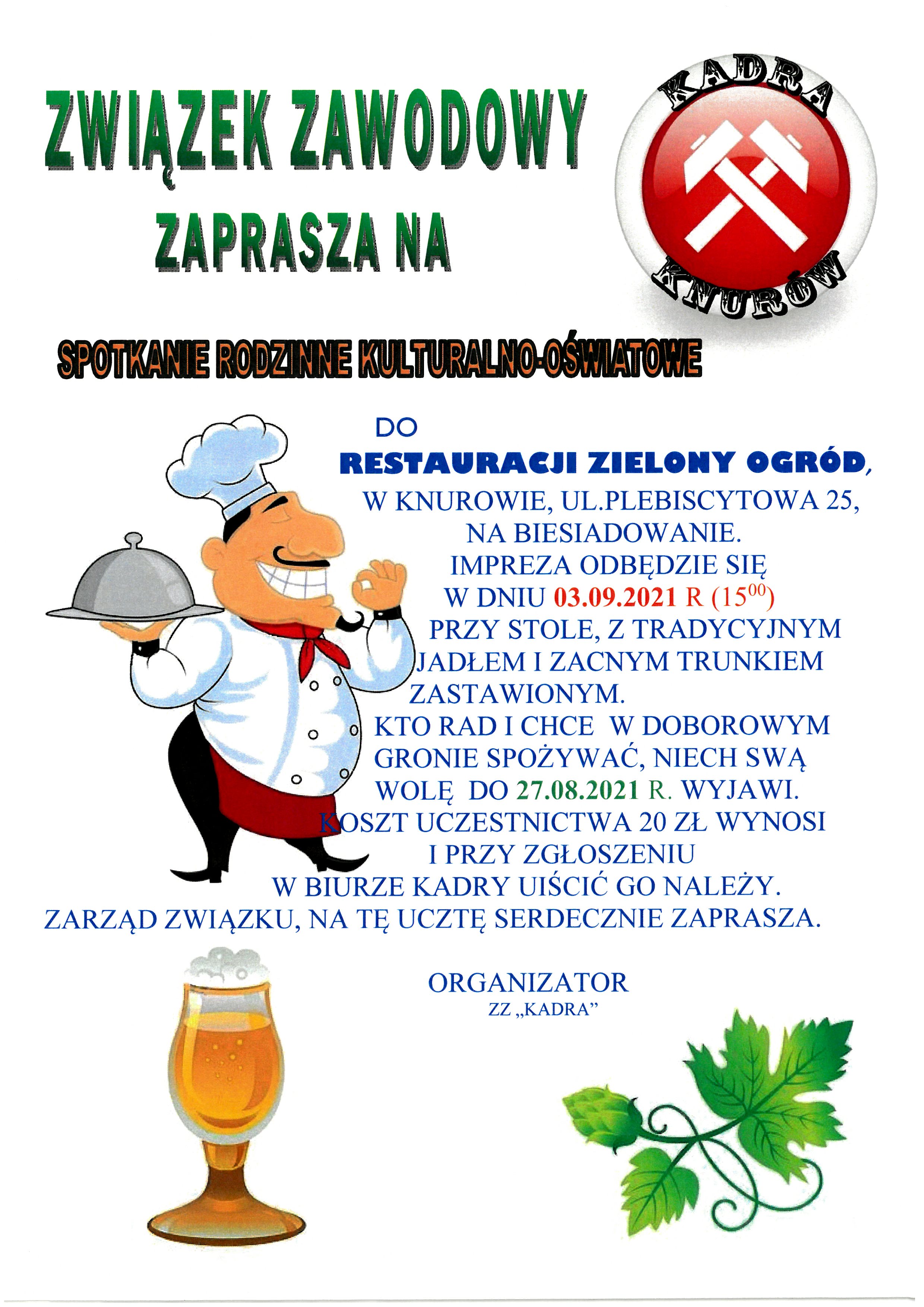 3.09.2021 Zapraszamy na spotkanie integracyjne do restauracji Zielony Ogród