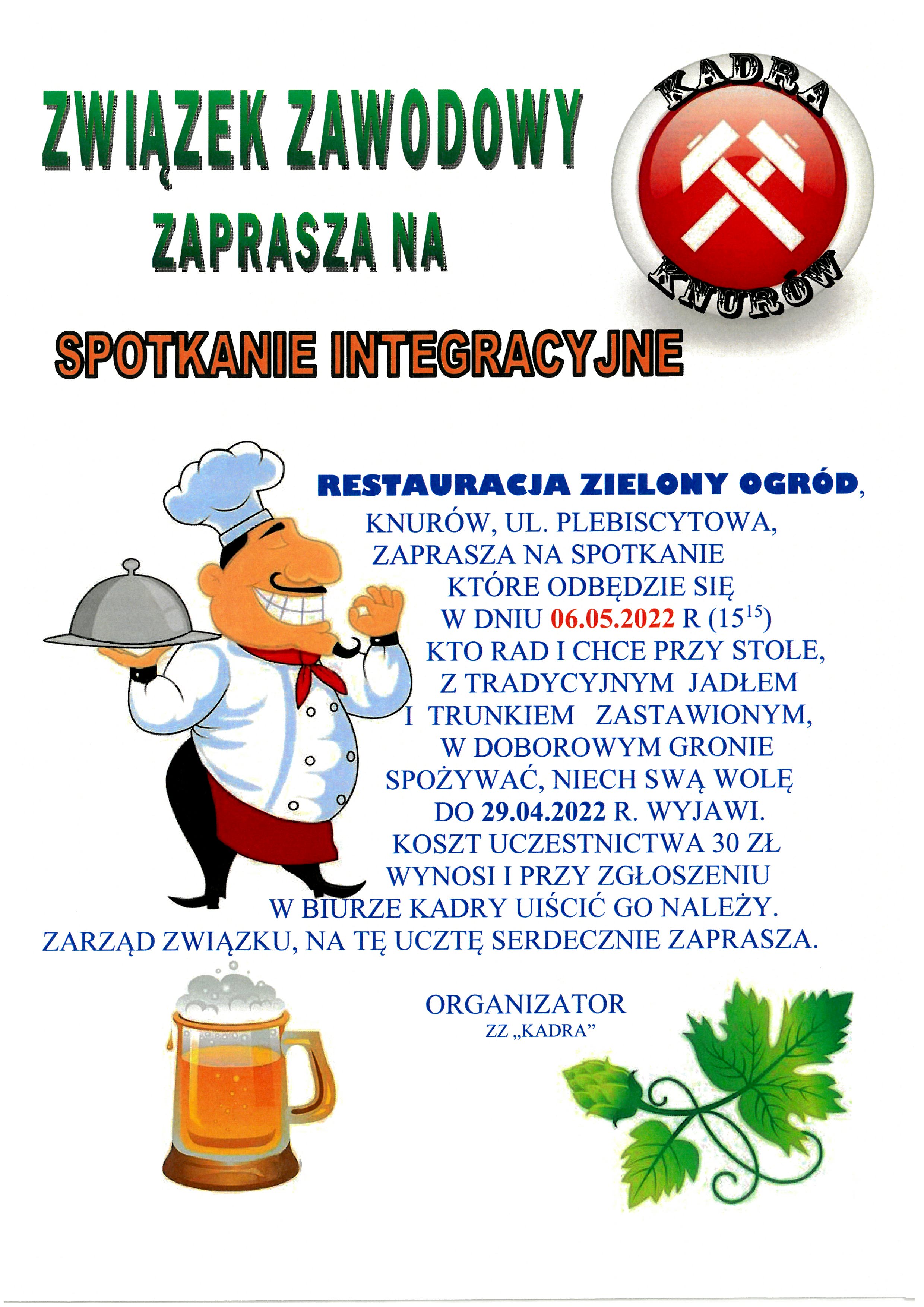 6.05.2022 Zapraszamy na spotkanie integracyjne do restauracji Zielony Ogród